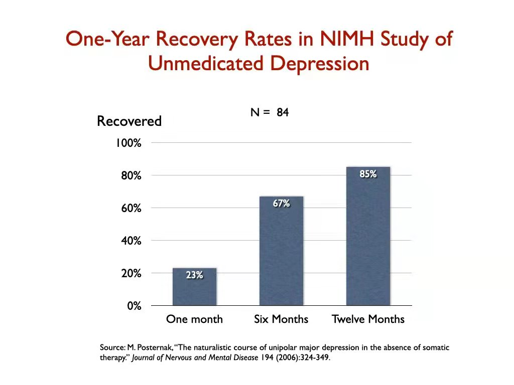 (译者注:未经治疗的抑郁症患者康复率,一个月23%,6个月67%,12个月85%